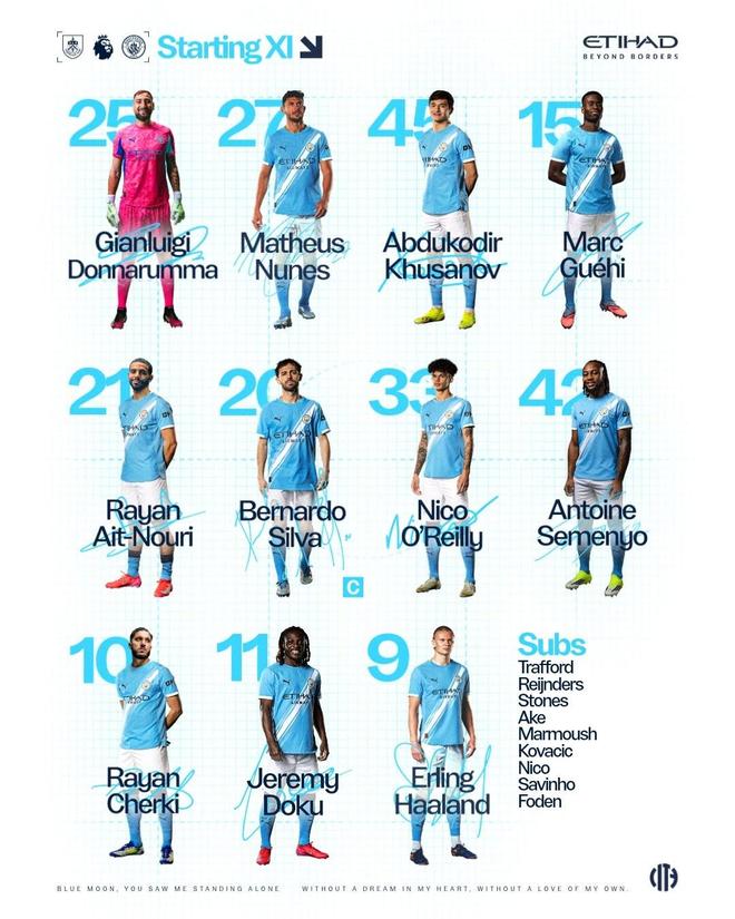 曼城客战伯恩利:哈兰德、谢尔基先发,罗德里缺席